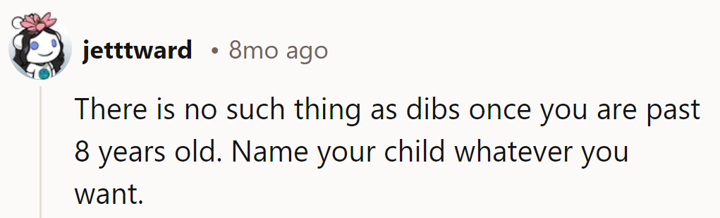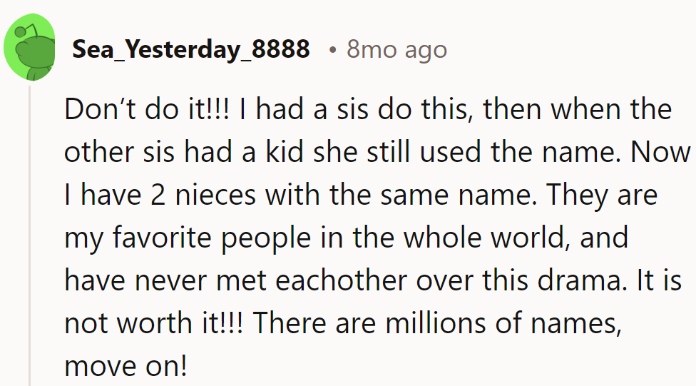 This situation leads to an awkward family standoff. Should the pregnant sibling honor the unwritten "dibs," or should she follow her own heart, risking family drama over a name she genuinely likes?