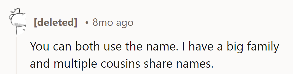 After all, no one can truly claim a name, and the child will likely grow into it regardless of its origins. Yet, feelings get tangled because names hold personal significance.