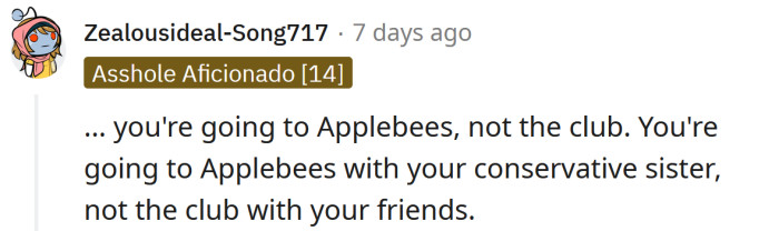 They weren't planning on going clubbing since the OP's sister is "super religious," but they decided to go out for dinner at Applebee's and then see a movie. However, when the OP's sister arrived at the restaurant, she was clearly upset about what the Redditor was wearing.