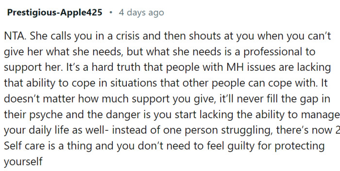 They suggested their sister contact help hotlines, but she felt these avenues were unhelpful. Carrying the weight of their sister's mental health crisis was proving difficult for OP, who was barely scraping by and certainly couldn't provide the support their sister required.