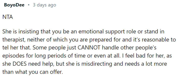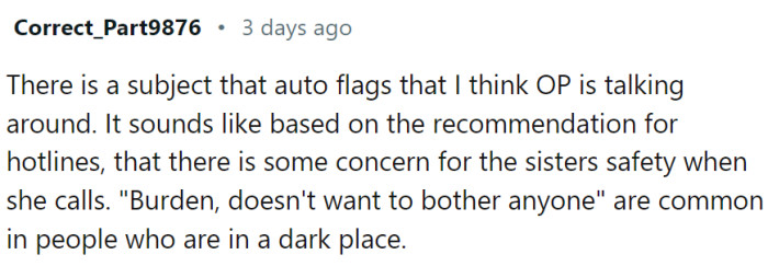 In this case, the Redditor's request for their sister to contact emergency services indicates a need for immediate support but also highlights their own struggles with mental health.