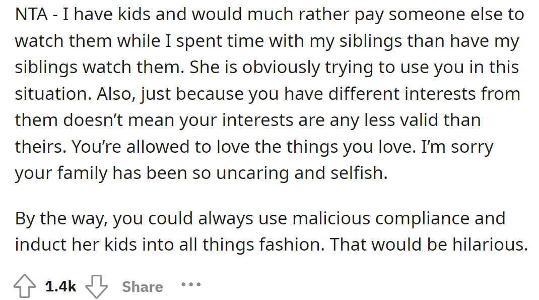 According to Redditors, the OP was not in the wrong for refusing to be an unpaid babysitter because her sister was trying to use her. The OP's family treats her very poorly just because she has distinct interests.