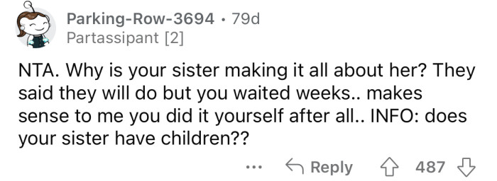 The Redditor told her sister she appreciated the help, but that she didn't need it on this occasion.