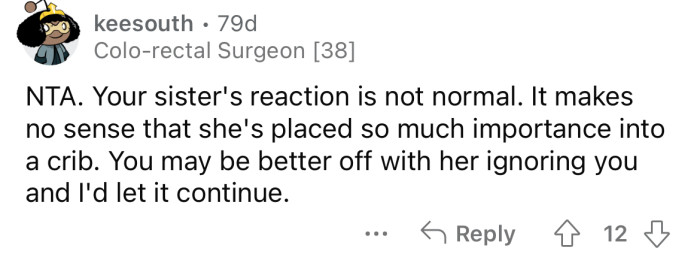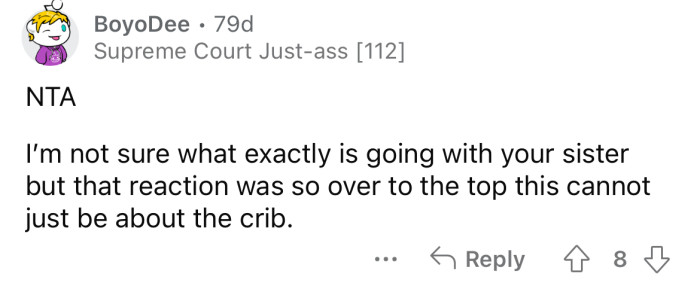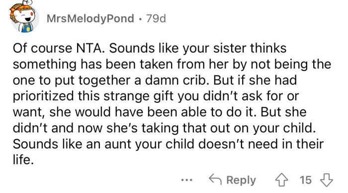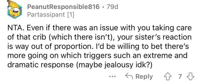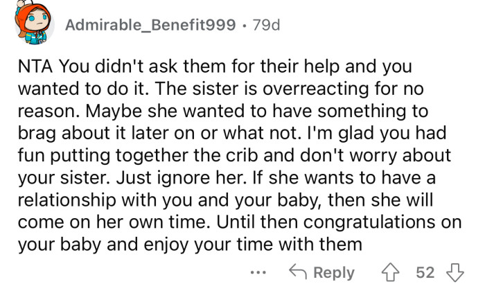 What's your take on this situation? Do you think the OP was wrong for building the crib herself when she knew her family wanted to do it, or was her sister completely overreacting?