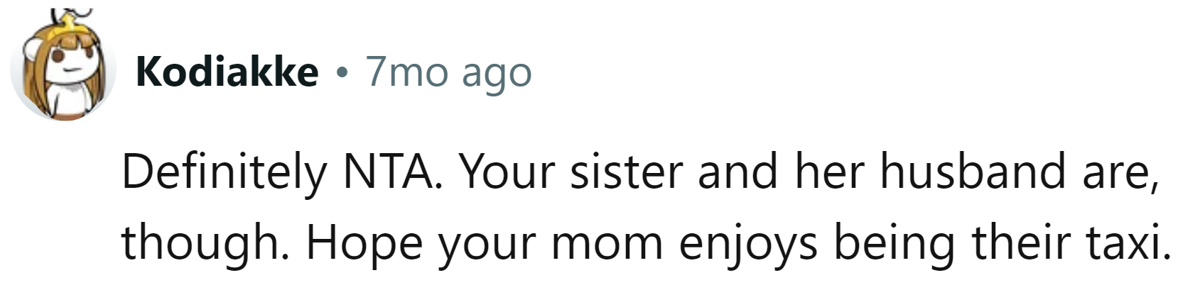When the Redditor's wife refused, his sister laughed and said, "It's not like you're working." The OP spoke to his sister and told her to stop expecting his heavily pregnant wife to be her Uber service.