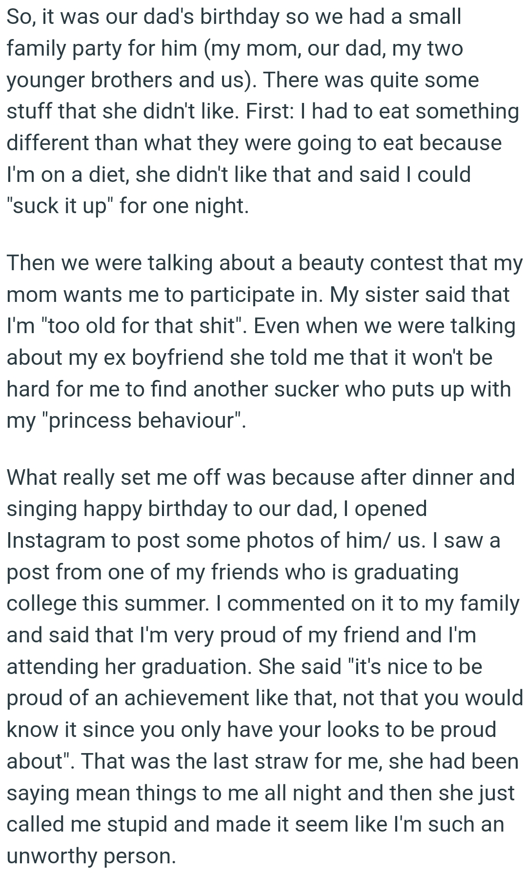 Their dad's birthday came, and everyone was present, but OP's sister started making some mean remarks to her. What upset the OP the most was when her sister said that the OP only had her looks to be proud of.