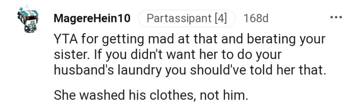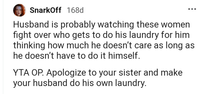 However, things took a different turn when OP's sister decided to do the husband's laundry, leaving her feeling upset.