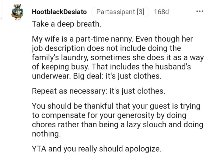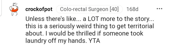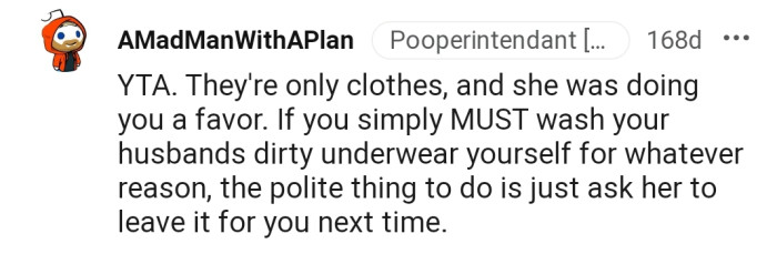 This Redditor has suggested a better way to approach the situation if OP is so concerned about someone doing her husband's laundry