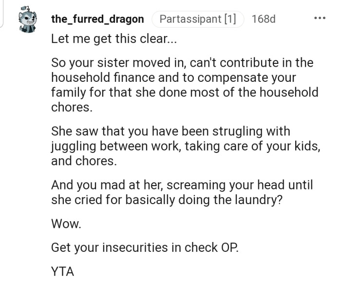 The Reddit community has decided to get behind OP's sister on this one. They feel she was only helping out and has been unfairly treated for trying to relieve OP of some stress.