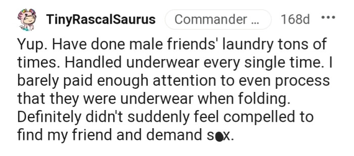 "Have done male friends' laundry tons of times...Definitely didn't suddenly feel compelled to find my friend and demand s*x".