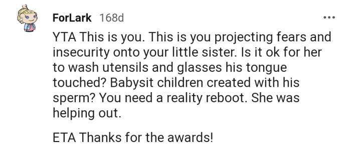 Interestingly, OP's husband didn't react to the situation, giving OP's sister more confidence that her action wasn't wrong. Now, OP is struggling with how to move forward and is wondering if she was in the wrong for berating her sister.