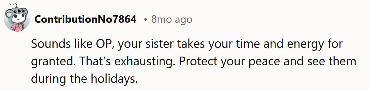 But ever since the baby arrived, the OP's sister has been calling her constantly and sending photos of the baby each day, asking when the OP will fly out to meet him. The OP says she could afford to go, but she's exhausted by her relationship with her sister.