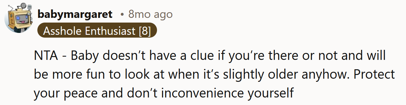 What are your thoughts on this situation? Do you think the OP is being unreasonable about not wanting to visit the baby sooner, or is she simply trying to protect her peace for as long as possible?
