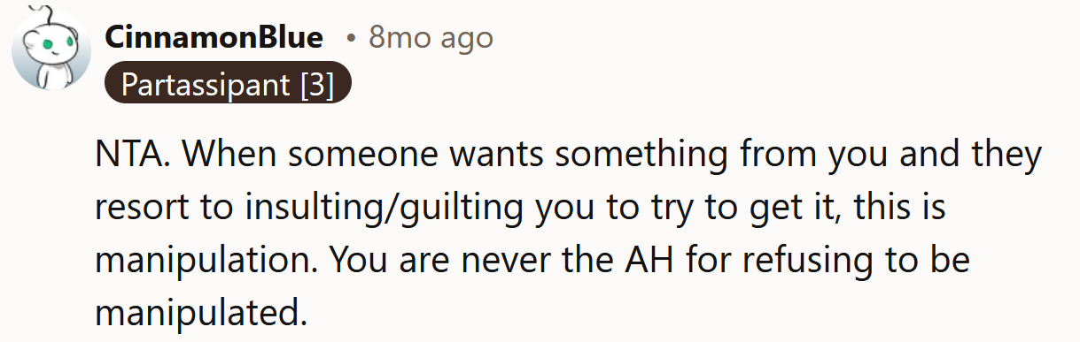 The OP's sister and her husband say the OP should be more understanding and that she should be there for her because she's family.