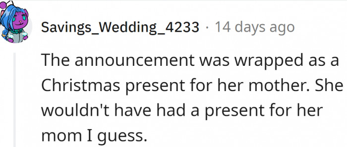 RedditOP recently proposed to his fiancée midway through December, and they agreed to announce the engagement at the family Christmas party.