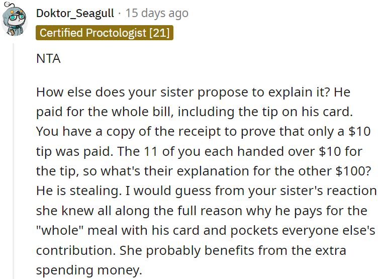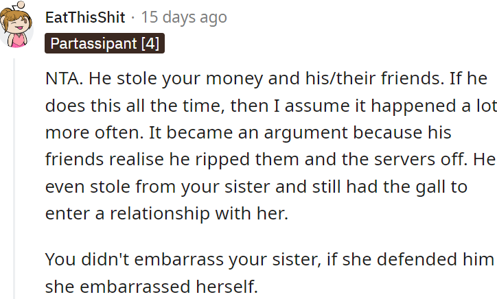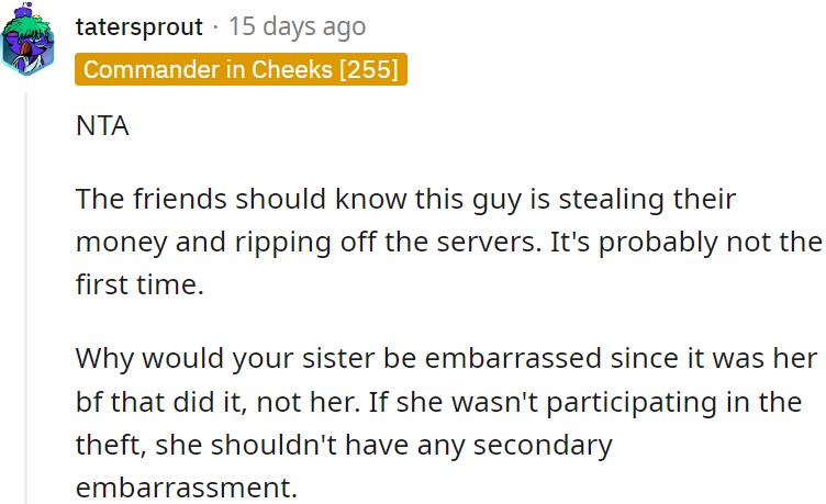 Redditors are solidly behind OP here. It's clear the sister’s boyfriend had been skimming off the top, and OP’s confrontation shed light on his shady antics.