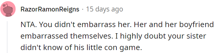 Their sister was furious, claiming OP embarrassed her publicly. Scroll down to find out the full details of this drama.