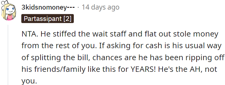 "NTA. He stiffed the wait staff and flat-out stole money from the rest of you."