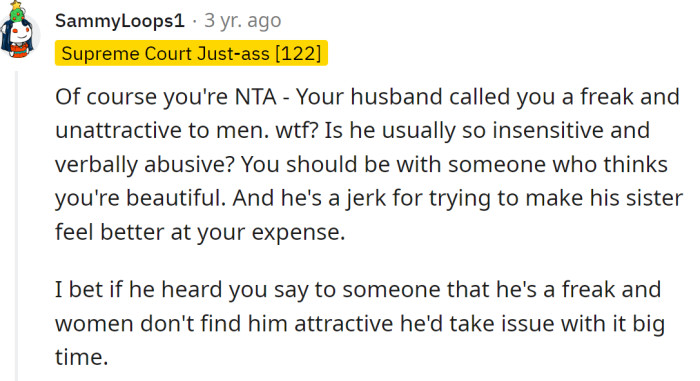 Then, the OP's husband tried to comfort her by saying terrible things about the OP's appearance:
