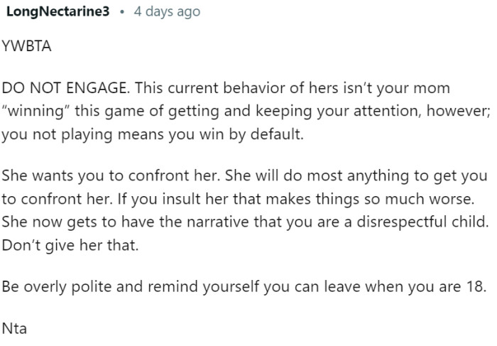 This noticeable change in their behavior has irked their mother, leading to more tension. Now, OP is contemplating telling their mother outright that they perceive themselves as intellectually superior and thus find no merit in discussing certain subjects with her.