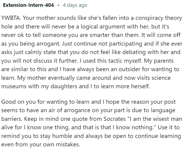 OP's mother, despite her misguided beliefs, might possess wisdom in other aspects of life that OP has yet to appreciate. Being right about certain topics doesn't equate to having all the answers or being more intelligent overall.