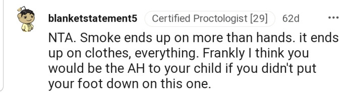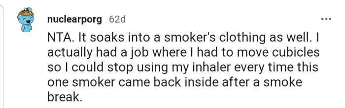 "NTA. It soaks into a smoker's clothing as well."