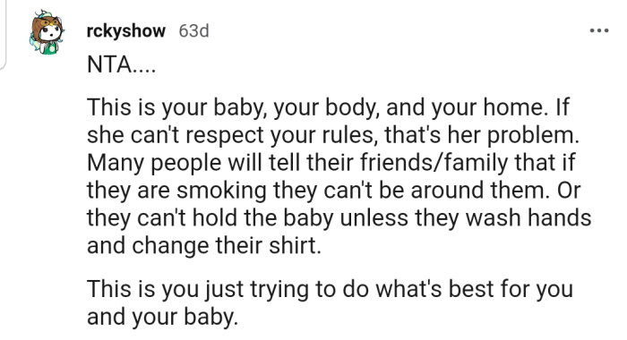 "This is your baby, your body, and your home. If she can't respect your rules, that's her problem."