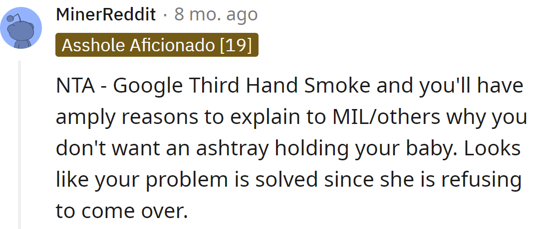 However, there are also those who always complain about something. So, when a Reddit user told her MIL that she didn't want the smell of smoke around their preemie baby, the MIL misunderstood completely.