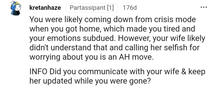Upon entering the house, he found his fiancée engrossed in a movie, unaware of the emotional whirlwind he had just experienced. With a detached tone, OP shared the positive outcome of the day, leaving his wife more concerned than happy.
