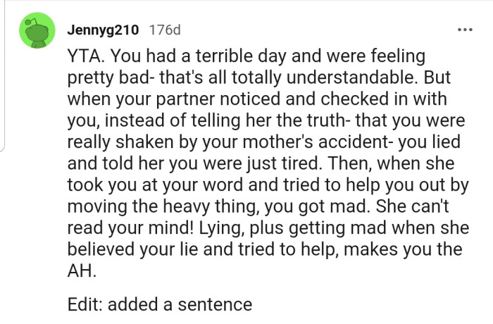 Reddit.comOP left his pregnant fiancée behind after getting a call that his mom was involved in an accident. Thankfully, he was able to get her back to his parents house in one piece