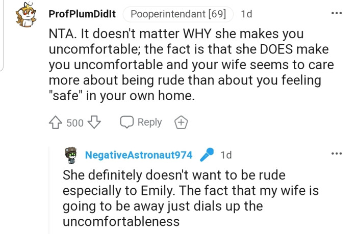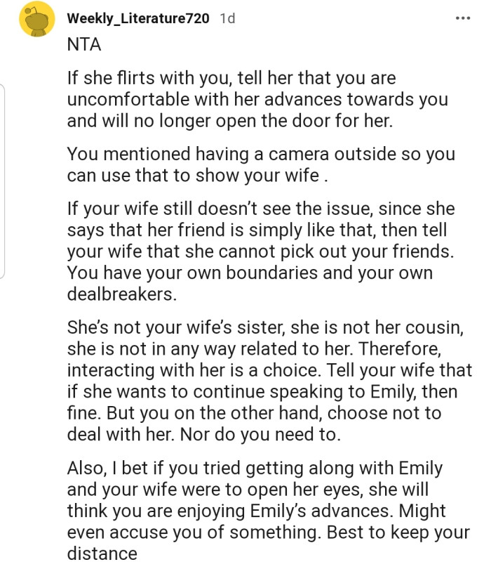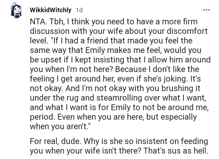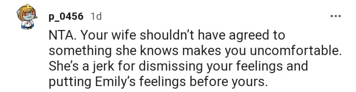 Reddit.comOP is uncomfortable around his wife's friend, Emily