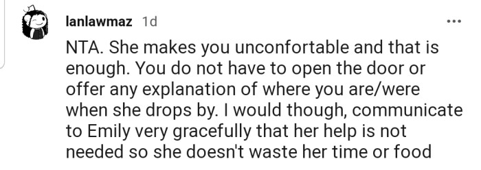 Reddit.comEmily offered to drop off food at their house from time to time, but OP has threatened not to let her into the house