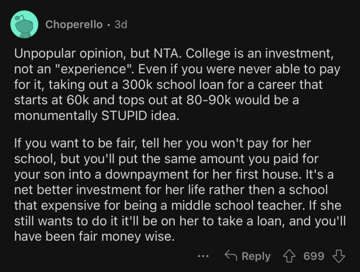 Investing in a college education remains a profitable endeavor despite the rising costs of tuition and other expenses. Some students finance their college education by taking out loans that they can repay after graduating. "It's essential to weigh the potential return on investment of a degree against its cost," says David Bach, a financial author and expert. Eventually, you are expected to pay that money back, so the cost is a crucial concern when it comes to selecting options. There's good debt and bad debt, so you wouldn't want to put yourself in a precarious situation. You need to conduct proper research about how much money you are likely to earn after graduating. If it's significantly less than what you plan to pay, it would not be wise to waste your money and time. A parent recently shared on the r/AmItheA**hole subreddit how he refused to pay for his daughter's education but is more than happy to pay for his son's. He compared the yearly earnings of each field and realized that the investment in his daughter would not be profitable. The user received a lot of interesting reactions to his post. Scroll down to check out the full Reddit post, and scroll a little further to read the comments from the original post.