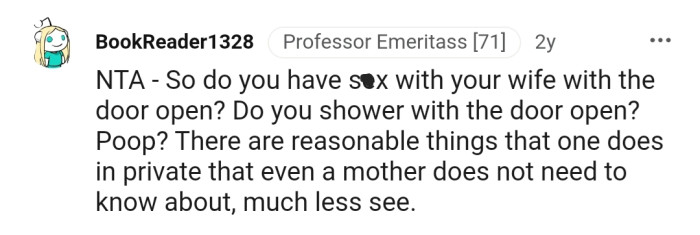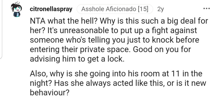 However, her stance on the situation didn’t change, so OP threatened that if she continued to enter their son’s room without knocking, he would get a lock for the room.