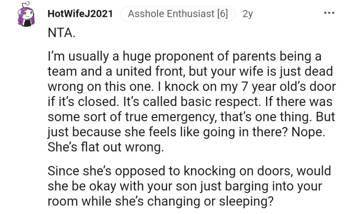 Do you think OP’s wife should knock before entering their son’s room? Let us know in the comments below!