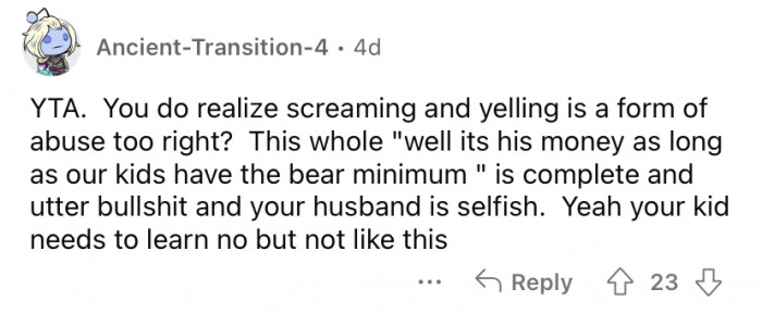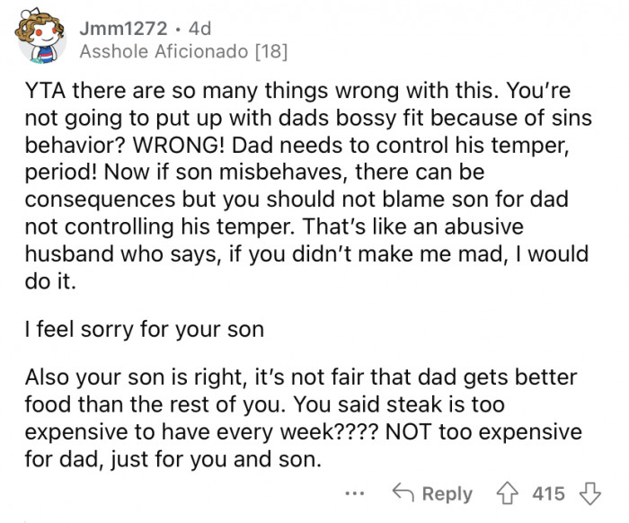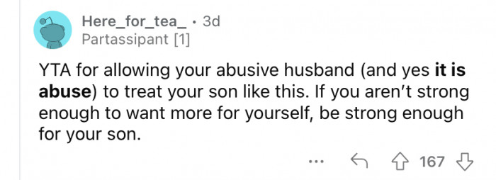 Later, the OP edited her post to clarify that her husband does not beat his son in any way; he "just yells" and "takes privileges." Keep scrolling to see how people reacted.