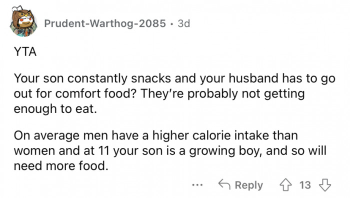 The Redditor stated she has never worried about Adam's food intake, as he isn't gaining weight or eating unhealthy foods. She mentioned that she usually cooks meals each day with enough leftovers for everyone to enjoy.