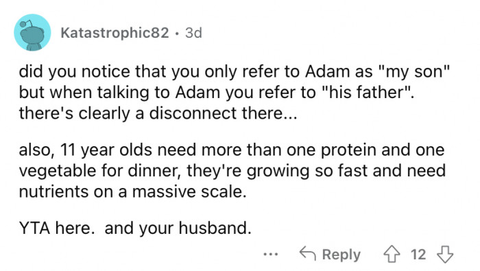 The OP says her husband told her she needs to teach Adam some respect, or he will do it for her. The Redditor has told her son not to eat the food because she doesn't want to "put up with his father's hissy fit," but Adam won't listen.