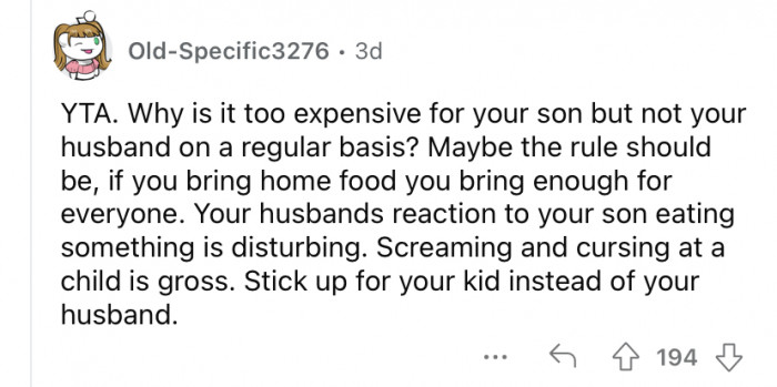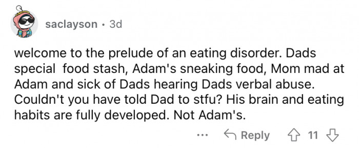 However, the Reddit user says that Adam often breaks that rule, which makes her husband angry. She noted that sometimes he screams and curses at Adam if he comes home to find his leftovers gone.