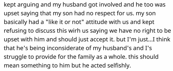 However, the son has made up his mind, stating that they have no right to be upset with him and should accept his decision. OP and her husband think that he acted selfishly and was inconsiderate about how his choice will put them in a tight spot.