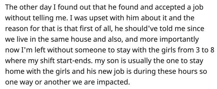 Tempers flared recently in their home when OP found out her son had accepted a job without informing them beforehand. She became upset about this news for two reasons.