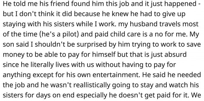 She says he knows perfectly well that he has to give up looking after his sisters if he takes the job. The son retorted that OP shouldn't be surprised that he wanted a job to save and pay for his own expenses.