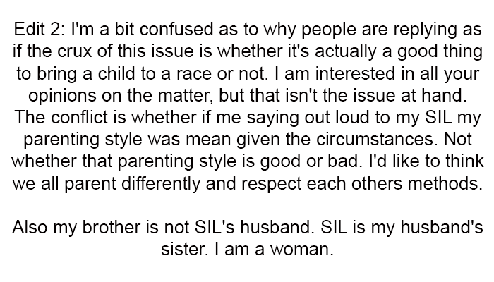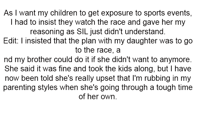 AITA For Insisting My SIL Bring Her Son To Watch Our Race