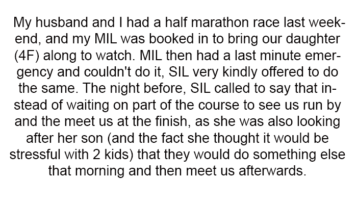The night before the race, SIL called to explain that managing both children at the event might be too stressful, suggesting they do something else instead. The mother insisted on sticking to the original plan, emphasizing the importance of her daughter seeing the race.