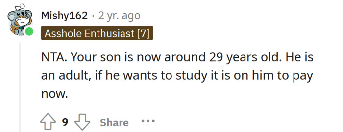 The Redditor says she and her hubby support their son's ventures 100%. However, the money they once offered is no longer available.