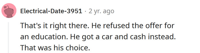 However, their son refused as he had decided he didn't want to go to college and intended to start working instead. He asked for the funds in cash as an alternative, but the OP and her husband told him they would only give him the money if it was for further education.