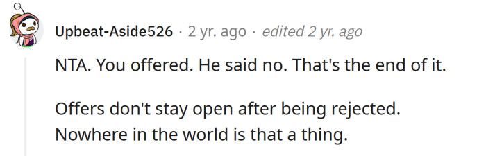 This request for financial assistance after years of refusal is a common scenario that reflects the complexities of familial relationships and financial obligations. Often, feelings of guilt or entitlement can cloud judgment, making it difficult to navigate these requests fairly.
