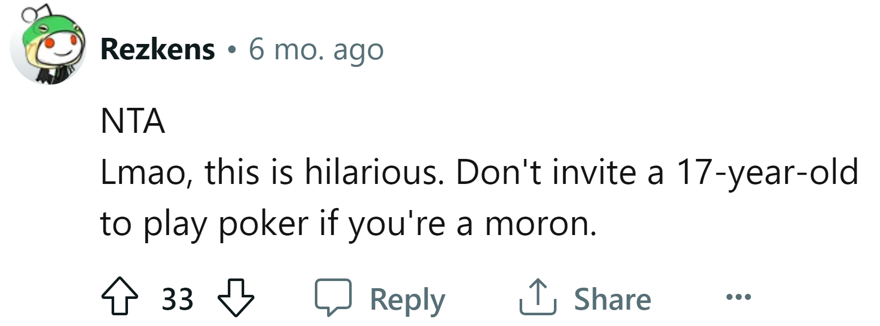 So, the OP came up with a plan to make the night more enjoyable. He pretended that he had never played poker before so that he could bait them and win money, ensuring that he would be guaranteed never to be invited again.