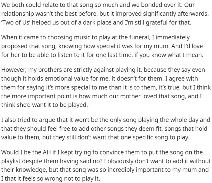 OP suggests playing a song called 'Two of Us,' which holds great meaning for her and her mother, but her brothers object, as it lacks emotional significance for them. Despite understanding their perspective, OP believes their mother would have wanted the song played.