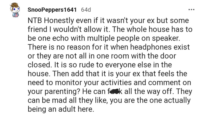 Reddit.com"NTB Honestly, even if it wasn't your ex but some friend, I wouldn't allow it. The whole house has to be one echo with multiple people on speaker."